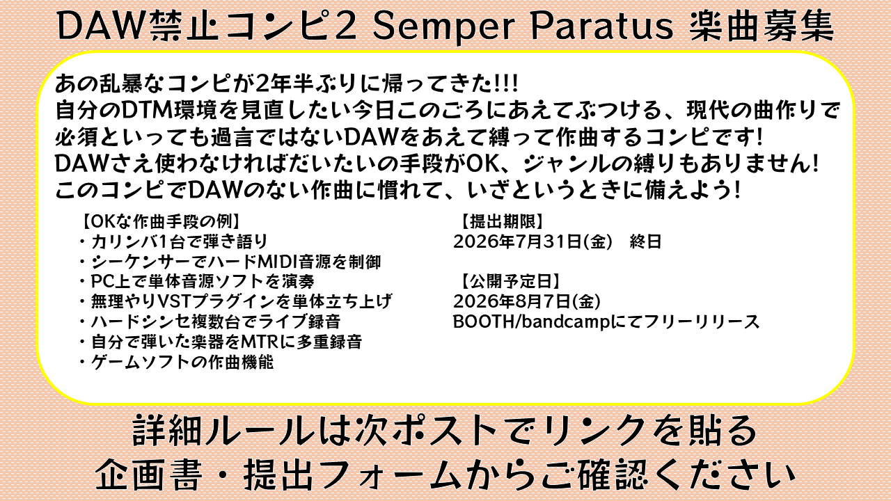 締め切りは同人音楽の春のシーズン、4~6月の各種イベントが終わってからでも間に合うように設定しています。